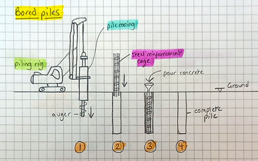 1: Drill down and install casing, 2: Insert steel reinforcement cage, 3: Pour concrete, 4: Remove pile casing (sometimes casing is left in the ground permanently)