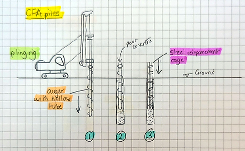 1: Drill down, 2: As auger is rotating and being removed, the displaced ground is being bought up with it whilst concrete is being poured through the hollow tube in the auger, 3: Install reinforcement cage