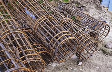 7. Reinforcement: reinforcement steel cages are lifted into position with the crane and lowered into the wet concrete usually using an excavator one the auger is withdrawn.