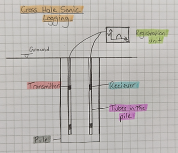 The waves are recorded by receivers placed in nearby access tubes, and the data is analysed to identify potential defects or variations in the pile.